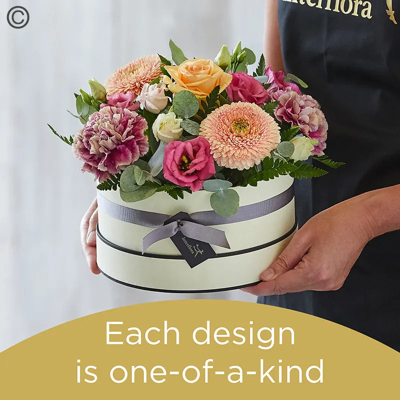 - An easy-to-care for arrangement of flowers in a chic hatbox
