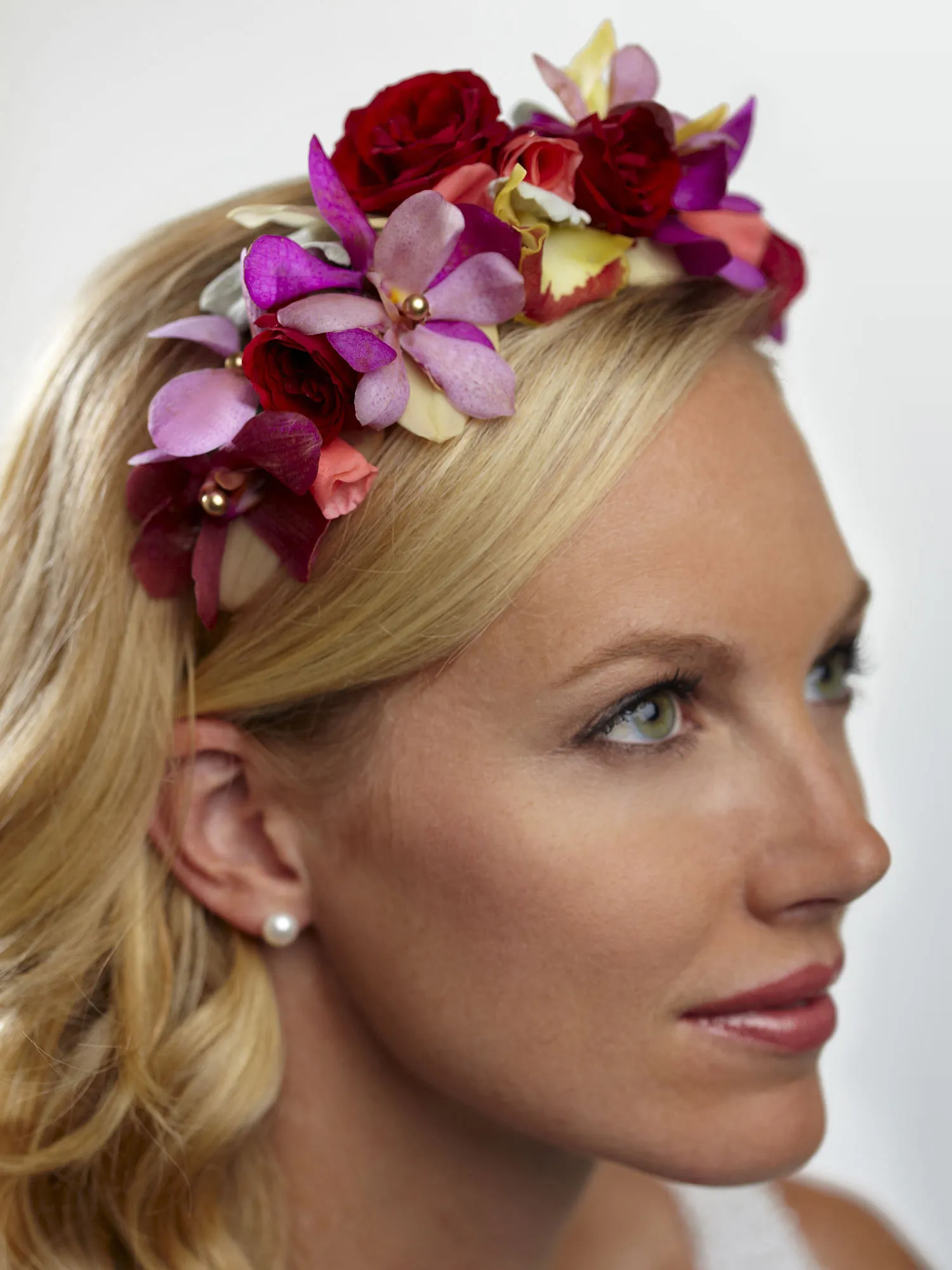 A stunning alternative to a tiara, this floral headband will give you an ethereal glow on your wedding day. Gold cymbidium orchids, coral roses, red spray roses, lavender vanda orchids, red vanda orchids, and dusty miller stems are arranged beautifully and secured to a headband to create a dramatic and colourful look. Approx. 19-inches in length and 3-inch in diameter.