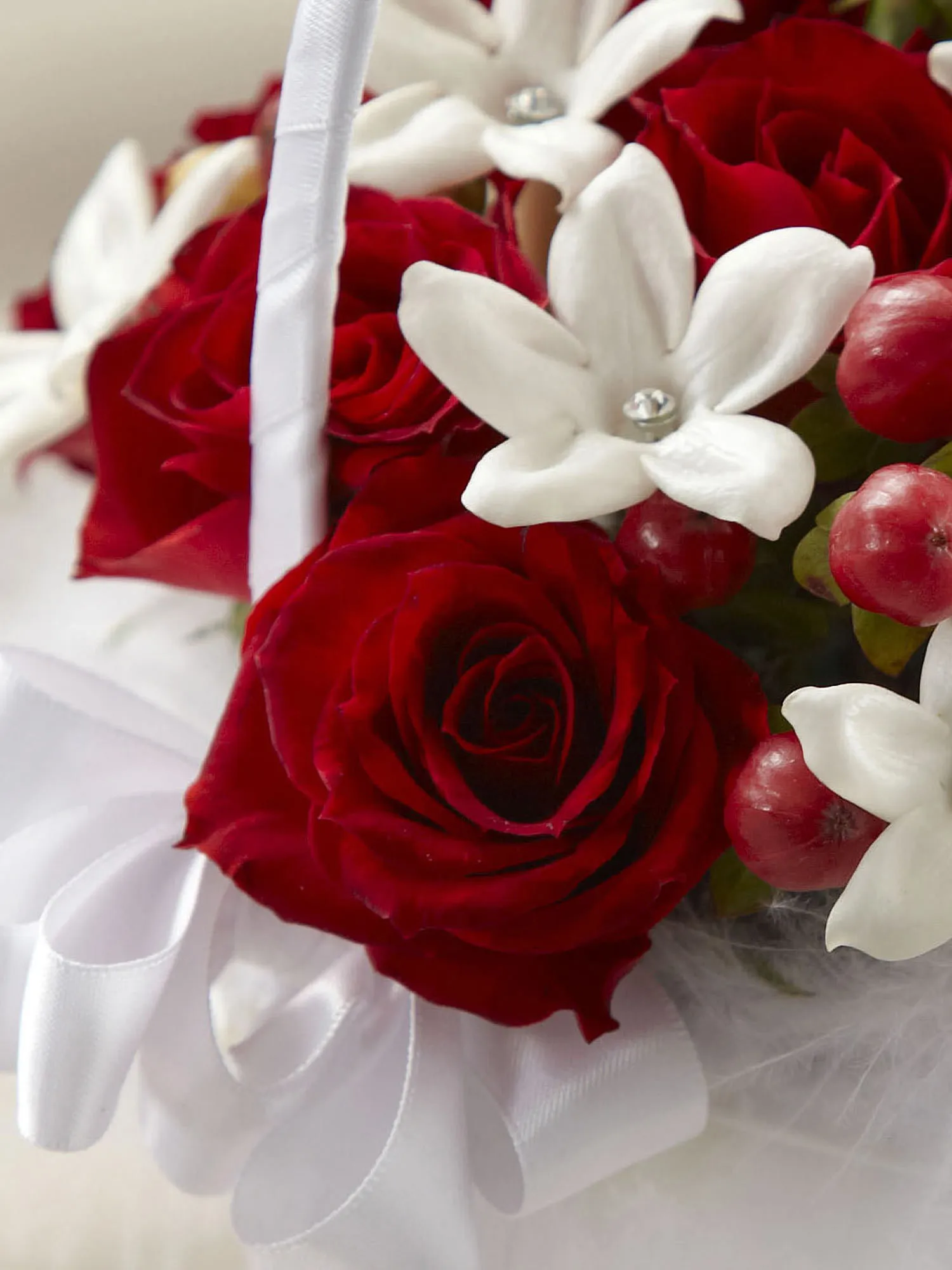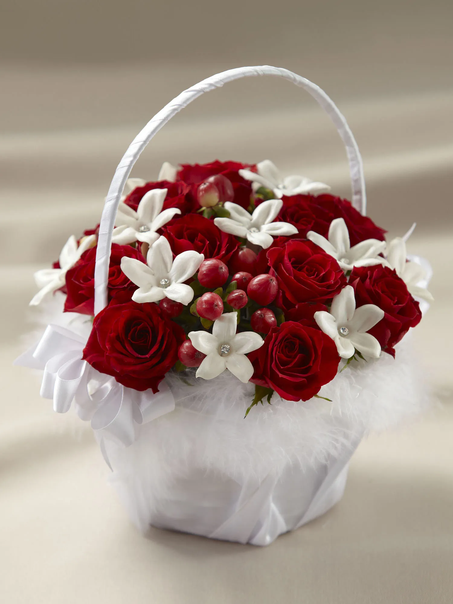 The Love and Purity Flower Girl Basket is a sweet and charming arrangement that your flower girl will love. Red spray roses, stephanotis blooms, and red hypericum berries are arranged in a handled basket covered with white satin ribbon and accented with white feathers around the rim, to give it an appealing and feminine look that will sweetly escort her down the aisle. Approx. 10″H x 7″W.