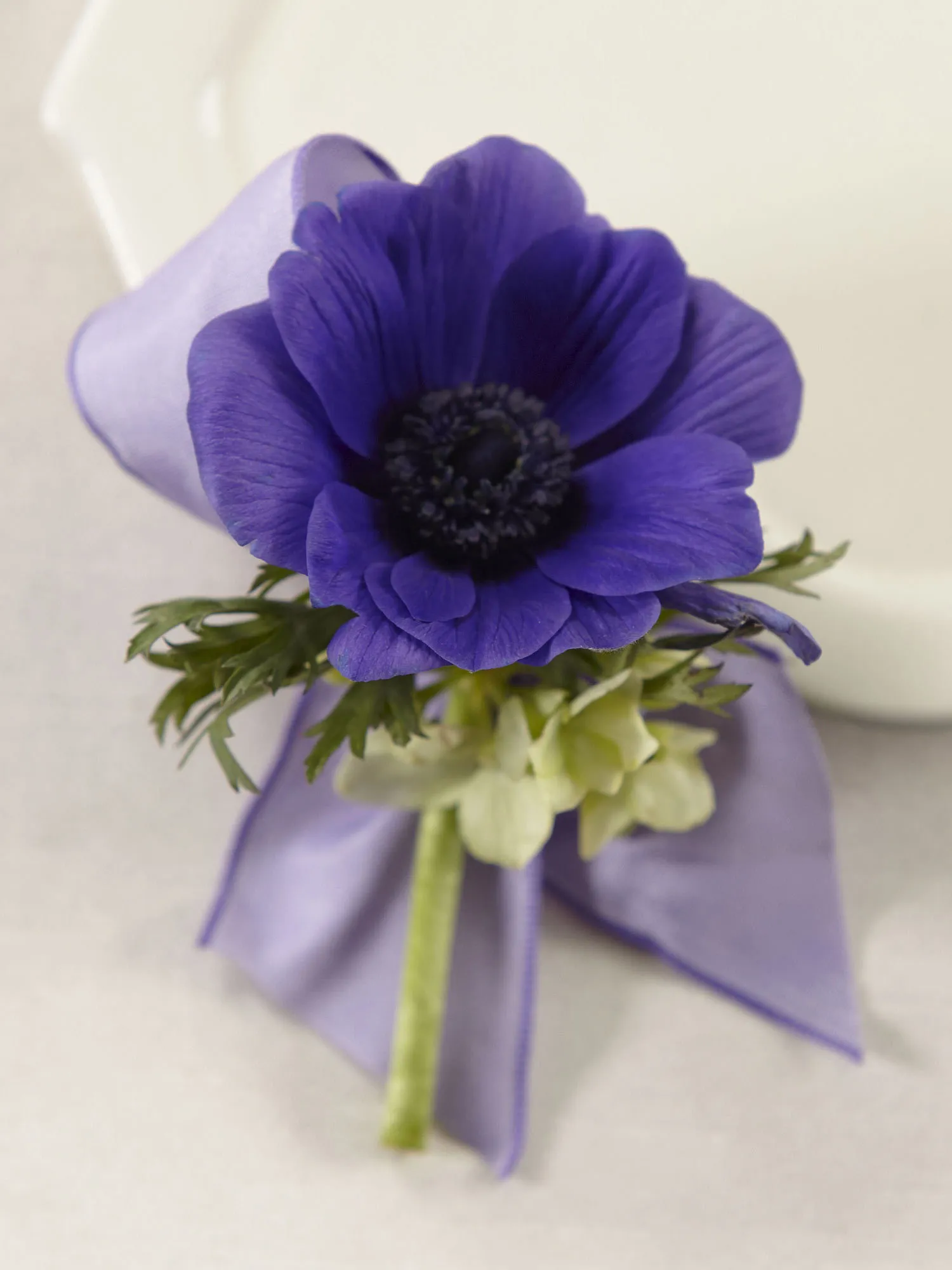 The Purple Passion Boutonniere is a gorgeous accent piece for your groomsmen. A single purple anemone stem is accented with green mini hydrangea blooms and lavender French taffeta ribbon to create a distinguished look. Approx. 4″H x 3″W.