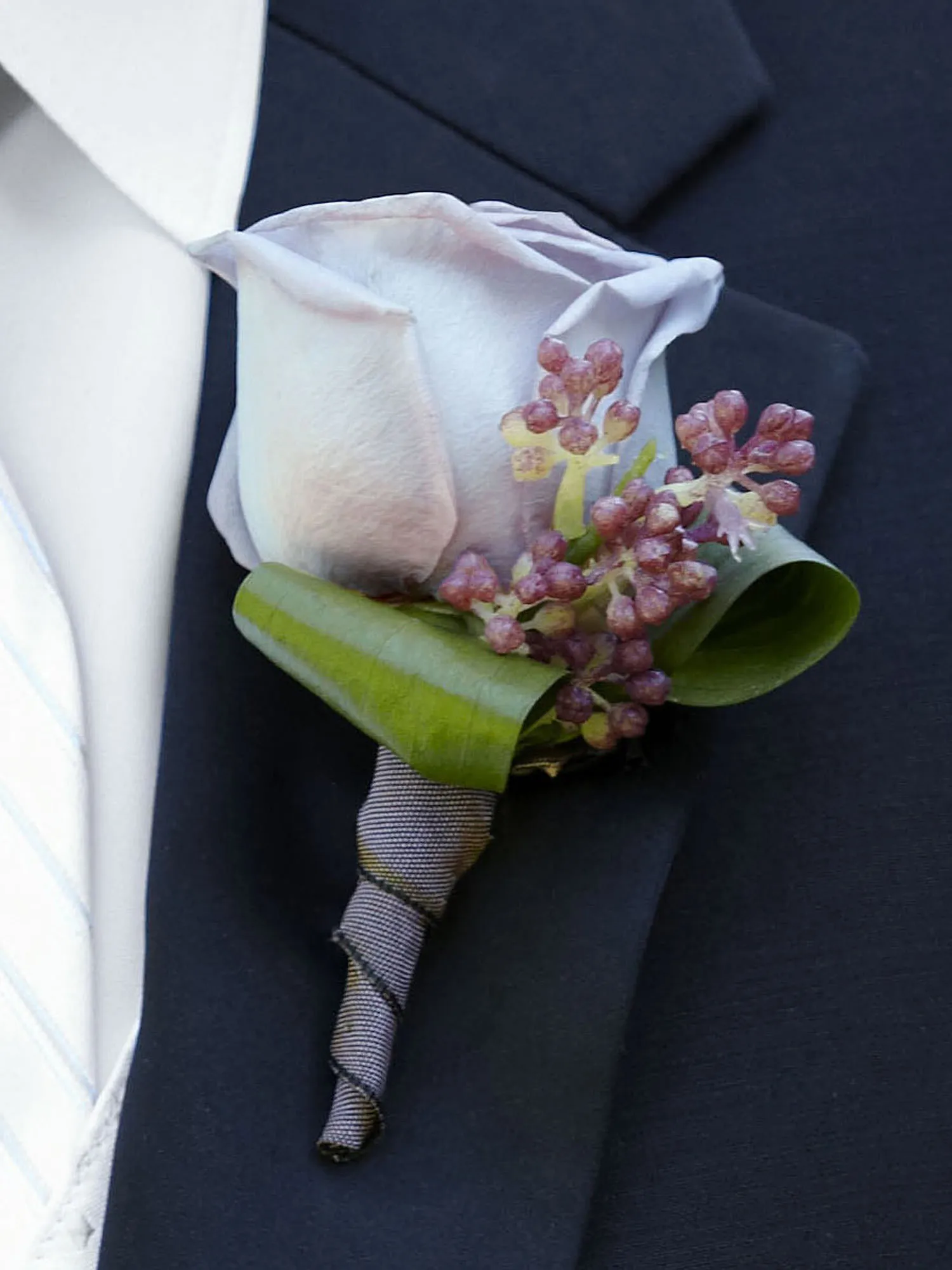 The Soft Lilac Boutonniere has a look of charm and elegance to complete the look of your wedding party. A single lavender rose is accented with lilac, green ti leaves, and a mauve satin ribbon to add to your wedding day style. Approx. 4″H x 2’W.