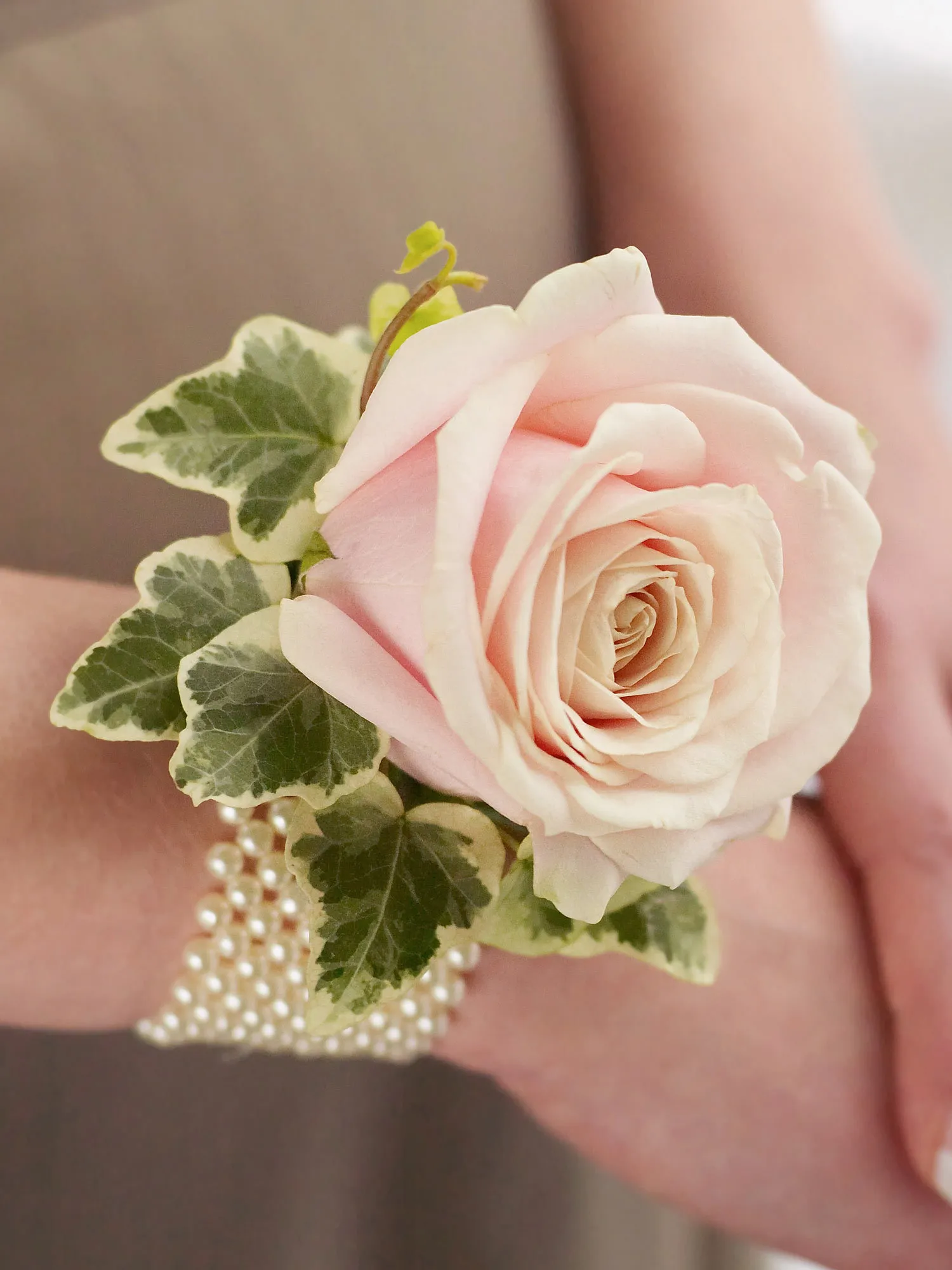 Its subtle shade of soft pink gives this attractive rose wrist corsage a wonderfully feminine feel. Set on a classic pearl wrist band, this pretty adornment has a timeless style that is simply enchanting.