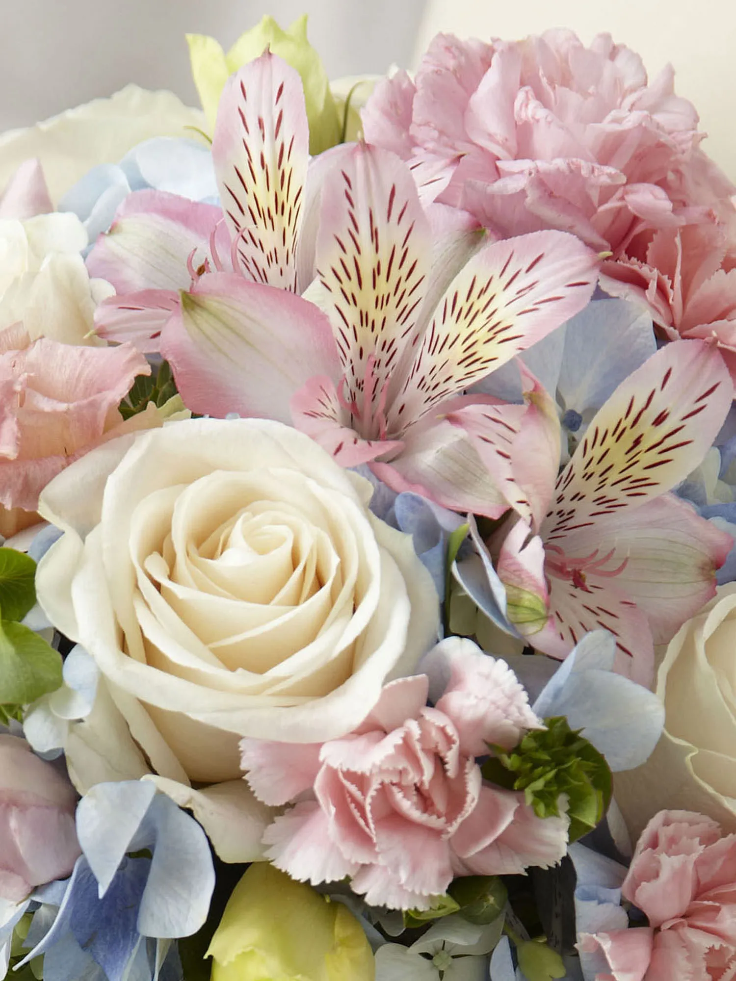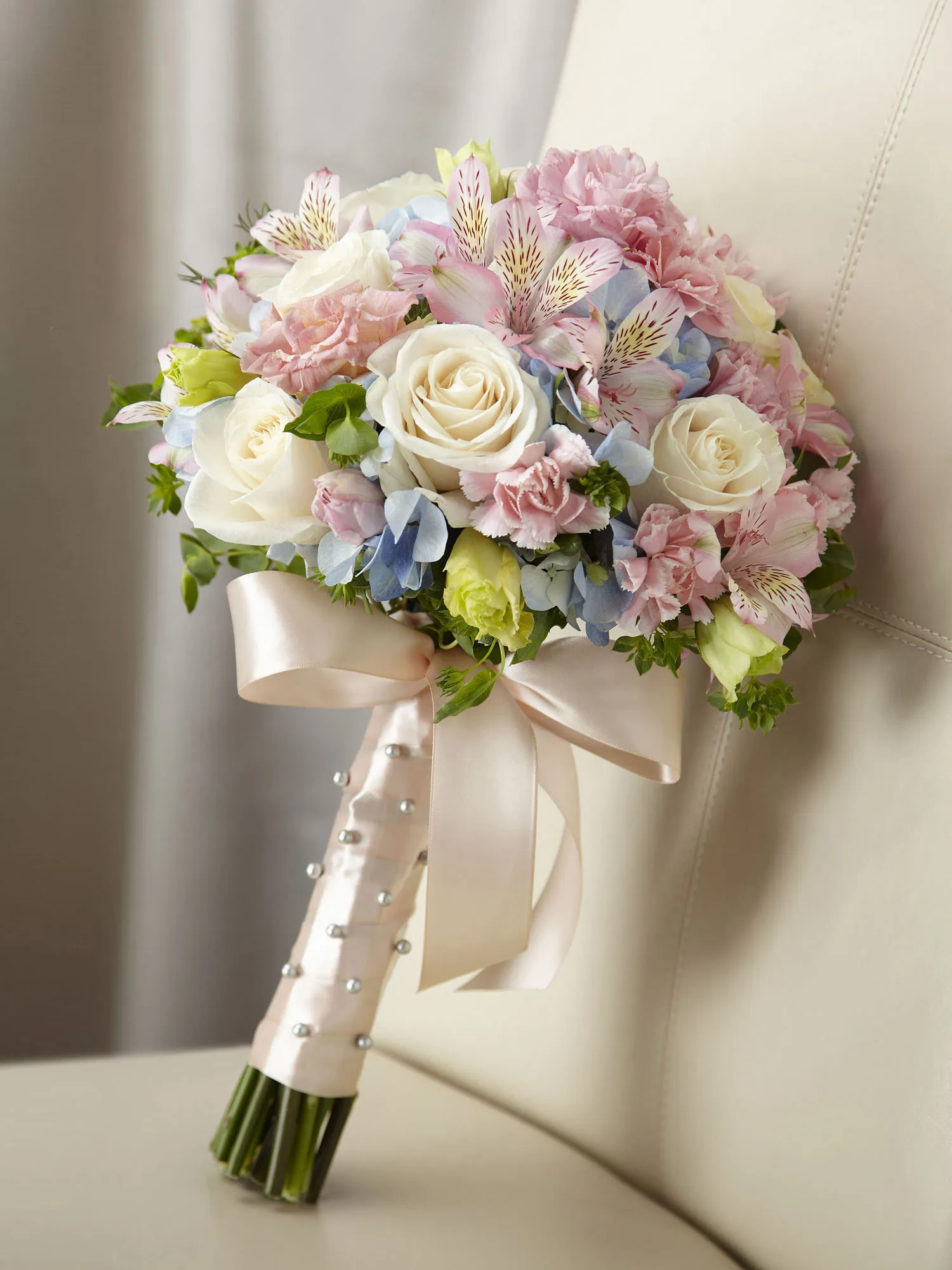 Blooming with sweet sentiments and endearing charm to get you to look your bridal best on your wedding day. Stunning cream roses, pink mini carnations, pink alstroemeria, pink double lisianthus, blue hydrangea and bupleurum are brought together to create a picture-perfect bouquet. Tied together with a soft peach satin ribbon accented with pixie pearl pins, this incredible styling culminates in a bow at the base of the bouquet. Approx. 16″H x 12″W.