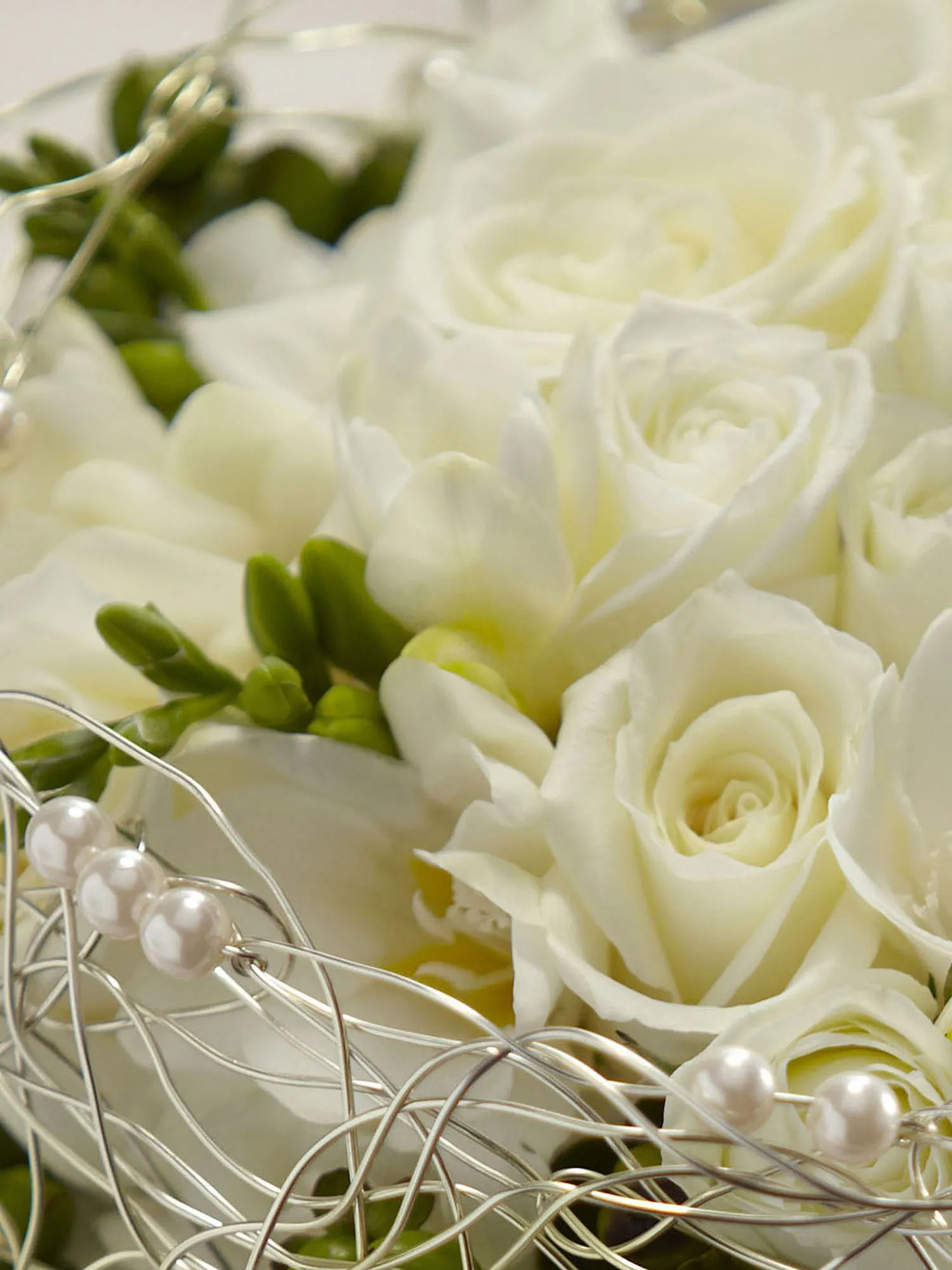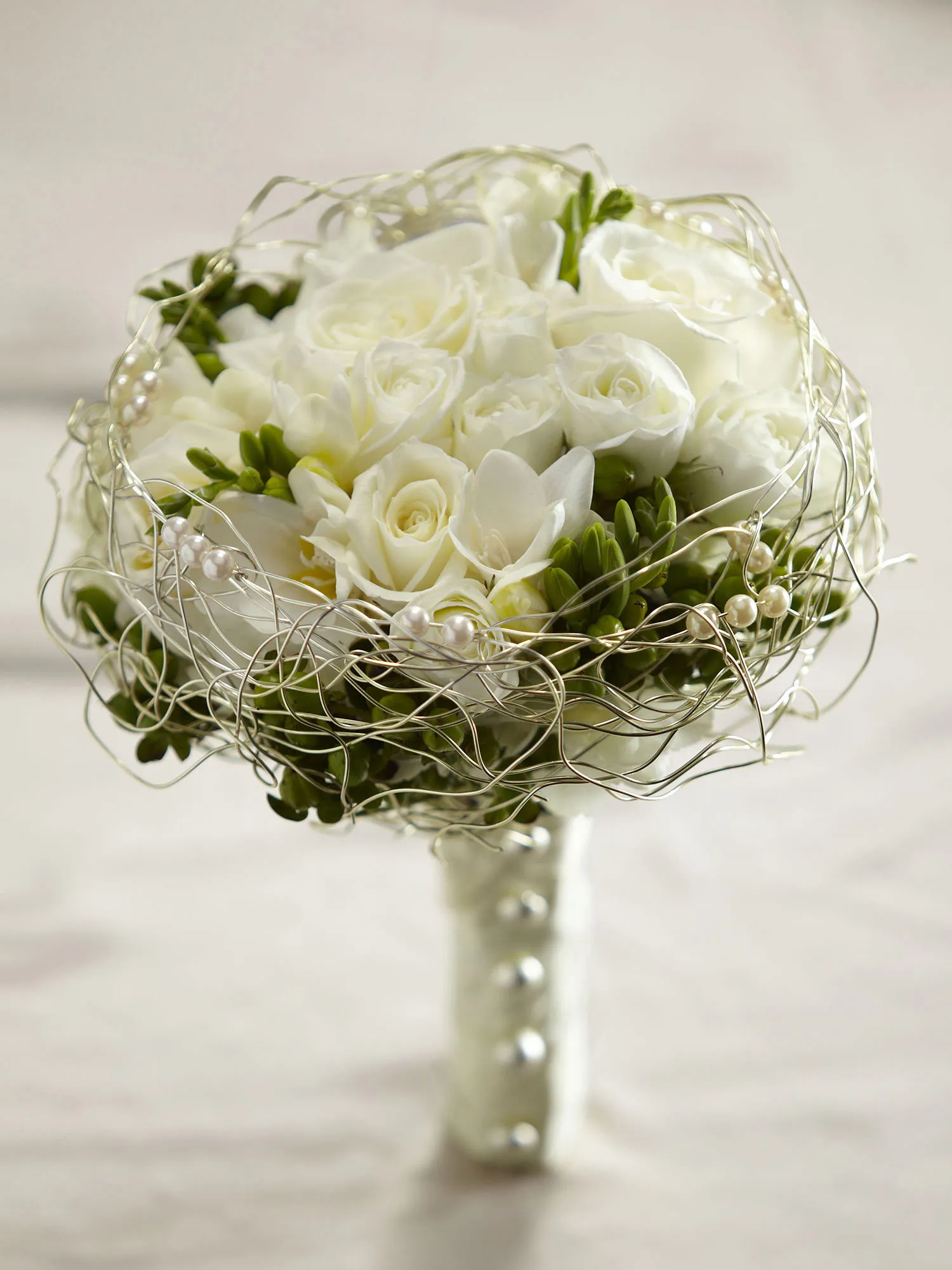 A romantic display of modern sophistication. White roses, spray roses, freesia, and hydrangea are accented with green hypericum berries and presented in an elegant gold wire bouquet collar displaying ivory pearls. With the stems wrapped in an ivory satin ribbon accented with domed silver buttons, this bouquet is the perfect accessory for your walk down the aisle. Approx. 9-inches in diameter.