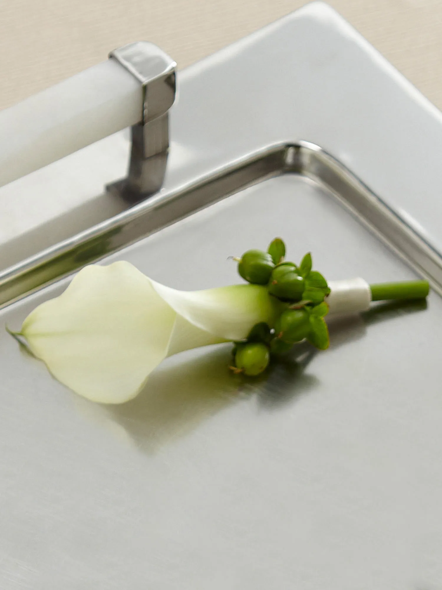 This White Calla Lily Boutonniere is the picture of elegant sophistication. A single full-sized white calla lily is chosen for its absolute perfection and accented with green hypericum berries and a white satin ribbon to compliment any wedding style. Approx. 5″H x 2″W