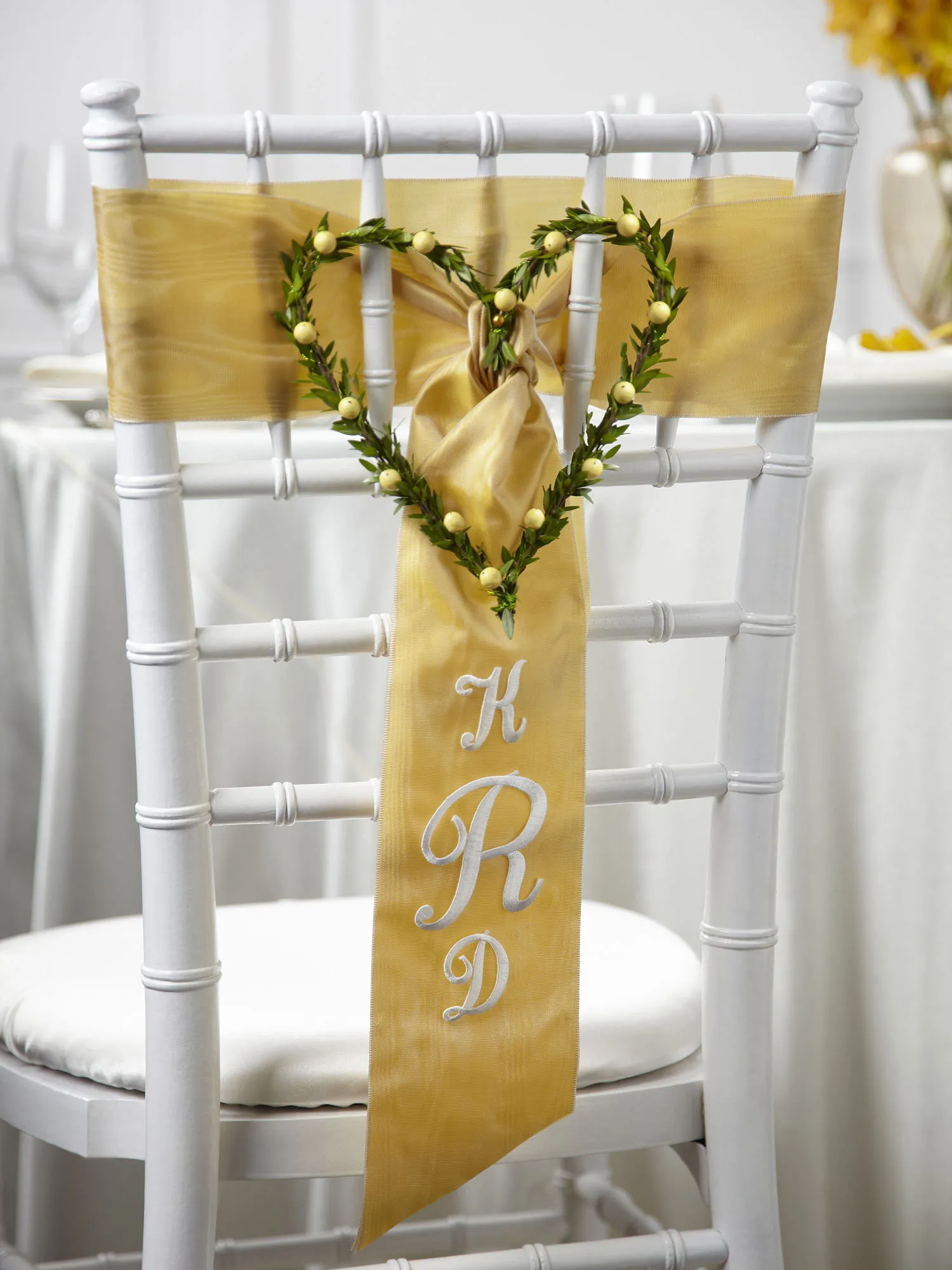 This unusual and truly beautiful chair decoration is an extra special touch to your wedding décor. Peach hypericum berries and mini myrtle stems form a perfect heart centered on a wide gold satin ribbon accented with the initials of the bride and groom. Approx. 9″H x 9″W.